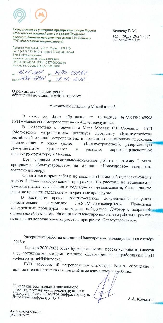В ответ на Ваше обращение от 18.04.2018 № METRO-69998 ГУП «Московский метрополитен» сообщает следующее.